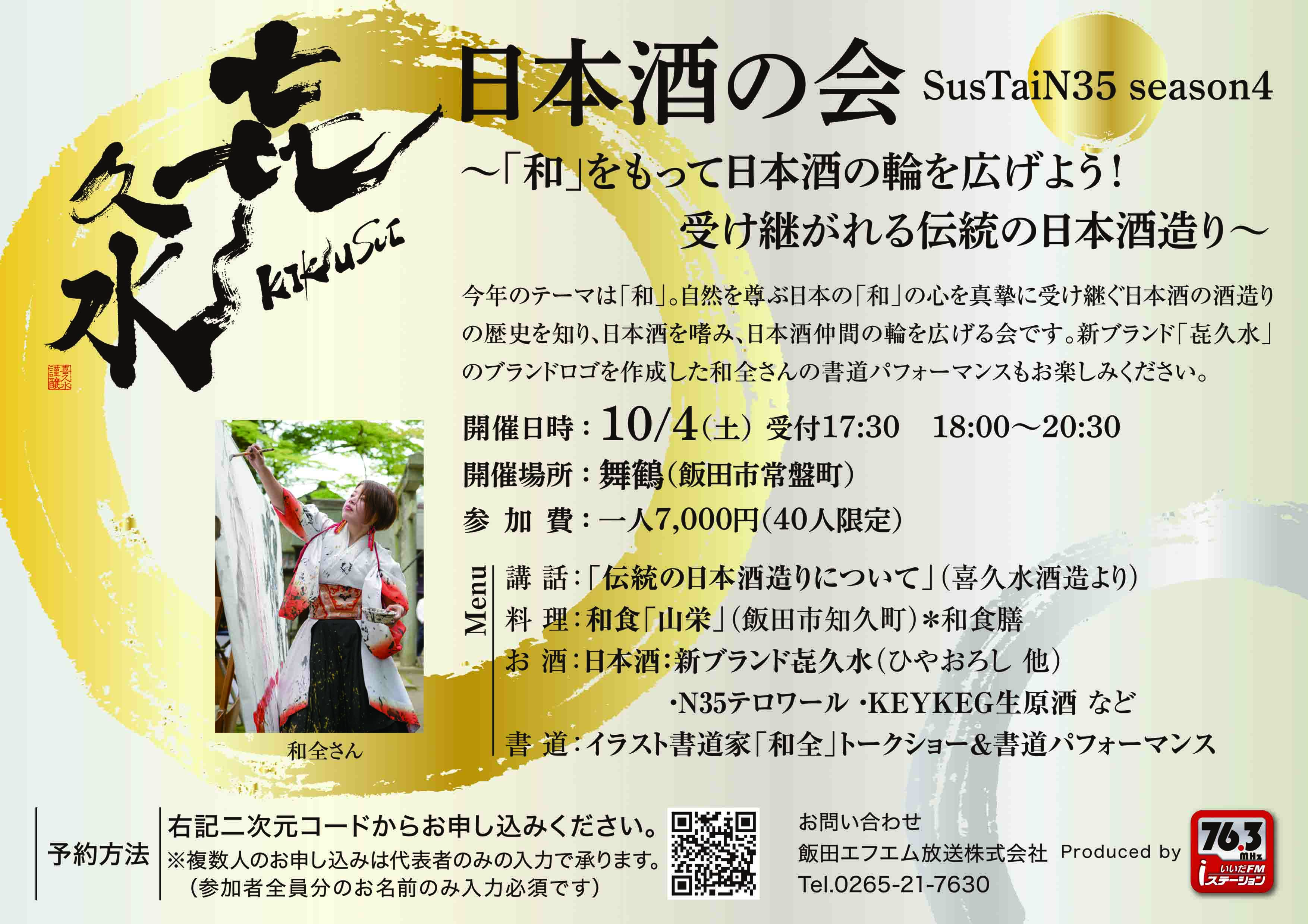 2025.09.01 SusTaiN35 season4 イベント情報イベント情報 SusTaiN35 season4 開催のお知らせ 今年も日本酒イベントを開催いたします。 今回は特別企画として、イラスト書道家 和全さんによるトークショー&書道パフォーマンスもあわせてお楽しみいただけます。 美味しい日本酒とともに、豊かなひとときをお過ごしください。 皆さまのご参加を心よりお待ちしております。 お申し込みは こちらをクリックしてください